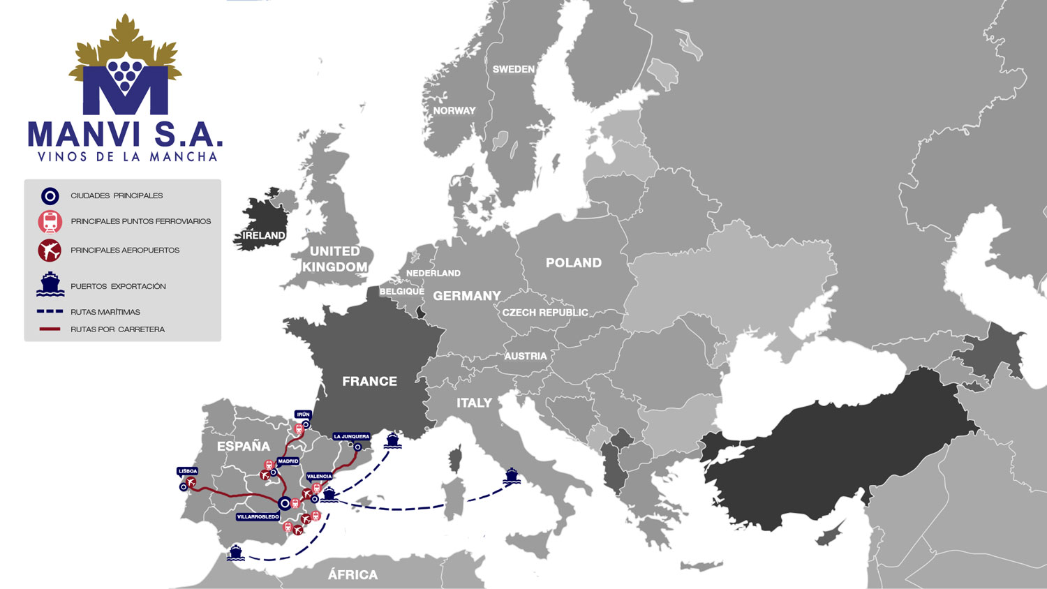 DONDE ESTAMOS MANVI se encuentra en Villarrobledo, provincia de Albacete, a 200 km de Madrid, capital de España y a otros 200 km del puerto de Valencia sobre el Mediterráneo, uno de los principales puertos de exportación de vinos españoles. Es punto de intersección de las principales vías de comunicación terrestres, por carretera y ferrocarril, de la península ibérica.